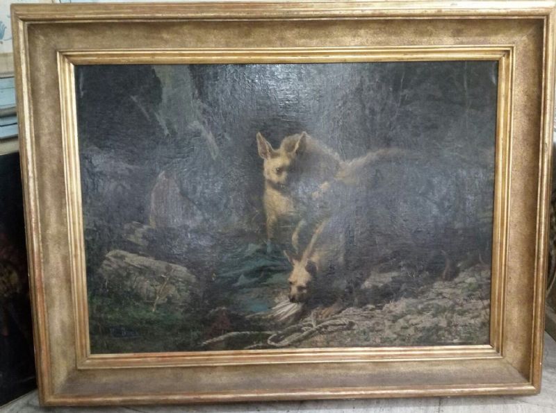 Olio su tela di Pietro Bouvier, dal titolo "Faine nella foresta" . Cornice in legno dorato. Pubblicazioni Bolaffi, catalogo dell` arte italiana, n 31 Milano 2002 p.89